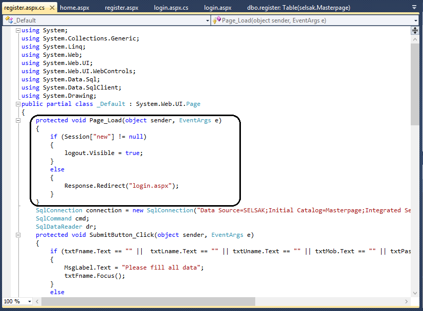 Step 4:- Open the form and Write the following codes which are given below in the page load:-
